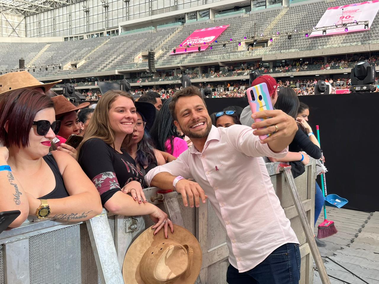- Após o fim da apresentação de Humberto & Ronaldo, o apresentador Mauro Mueller, do Show de Bola, marcou presença no evento