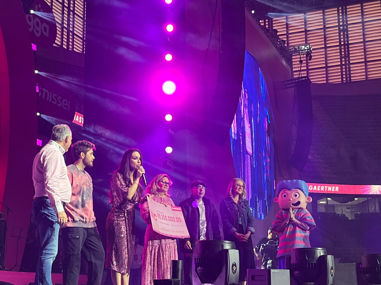 - Hospital Erasto Gaertner faz ação no palco falando sobre a importância da conscientização do câncer de mama. Como resultado do evento beneficente do Grupo Massa, o hospital arrecadou R$ 300 mil.