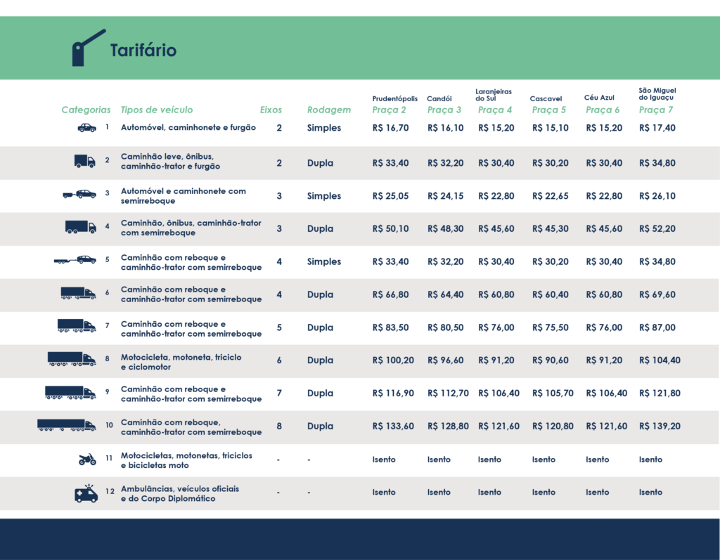 Todos os valores já estão previstos no novo contrato de concessão. As tarifas variam de acordo com cada praça de pedágio. Confira tabela abaixo.