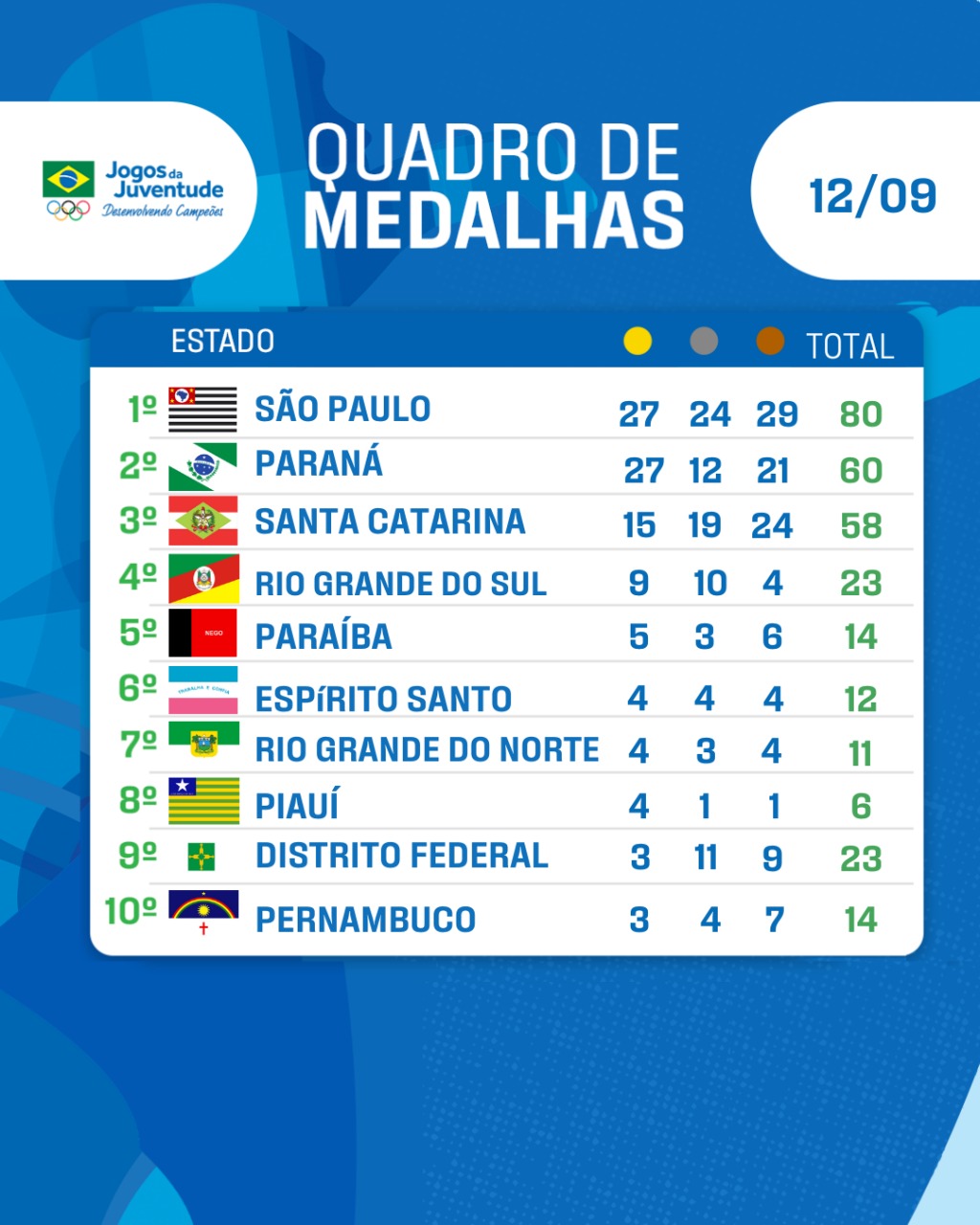 Com o total de 60 medalhas (entre ouro, prata e bronze), o Paraná fica apenas atrás de São Paulo, com 80 medalhas, no ranking dos Jogos da Juventude.
