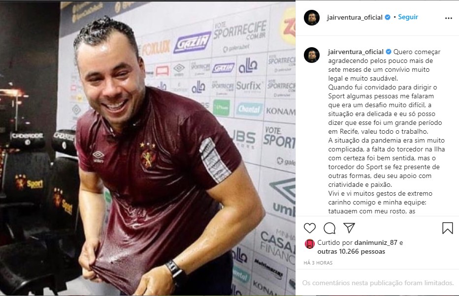 Logo após o desligamento do comando técnico do Sport, o treinador publicou no Instagram uma mensagem comovente agradecendo o apoio e as manifestações de afeto da torcida durante sua passagem pelo clube.