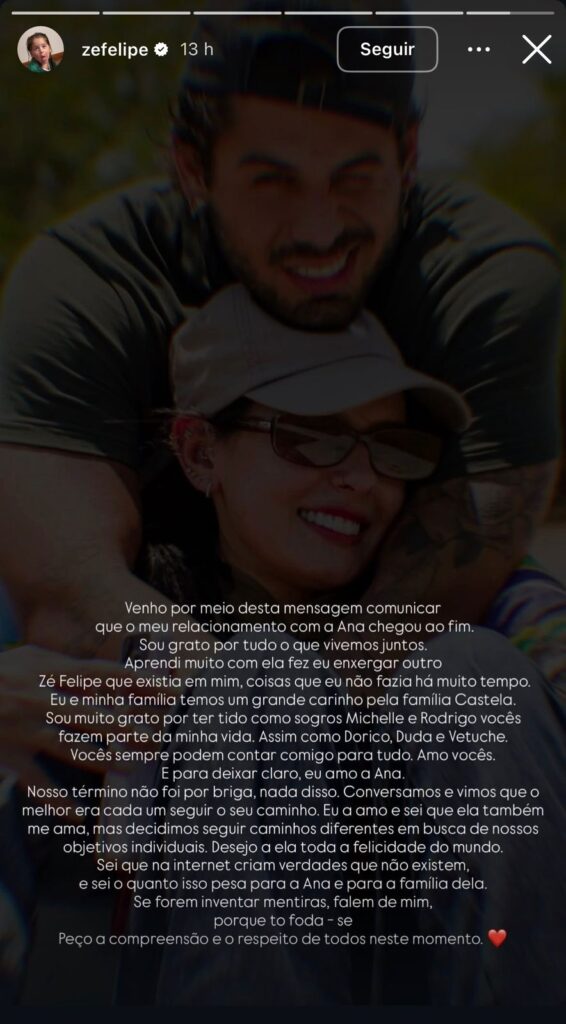 Em sua publicação, o cantor afirma ainda amar e respeitar Ana Castela, e diz que o término foi amigável. Confira abaixo o texto completo anunciando que Ana Castela e Zé Felipe terminaram: