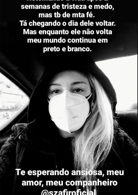 “Retomando a vida após duas semanas de tristeza e medo, mas também de muita fé. Está chegando o dia dele voltar. Mas enquanto ele não volta, meu mundo continua em preto e branco. Te esperando ansiosa, meu amor, meu companheiro”, escreveu.
