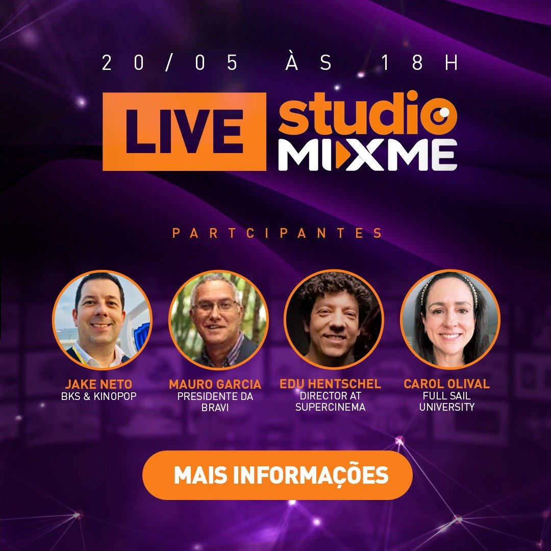 O encontro é organizado pela Mixme, plataforma que oferece o maior guia de filmes e séries on demand do país e que nasceu de uma joint venture entre a agência americana de inovação e tecnologia Hooku e a Use Mais Brasil. O debate inaugura o projeto Studio Mixme, que ao longo do ano promoverá outras lives para discutir o setor audiovisual.
