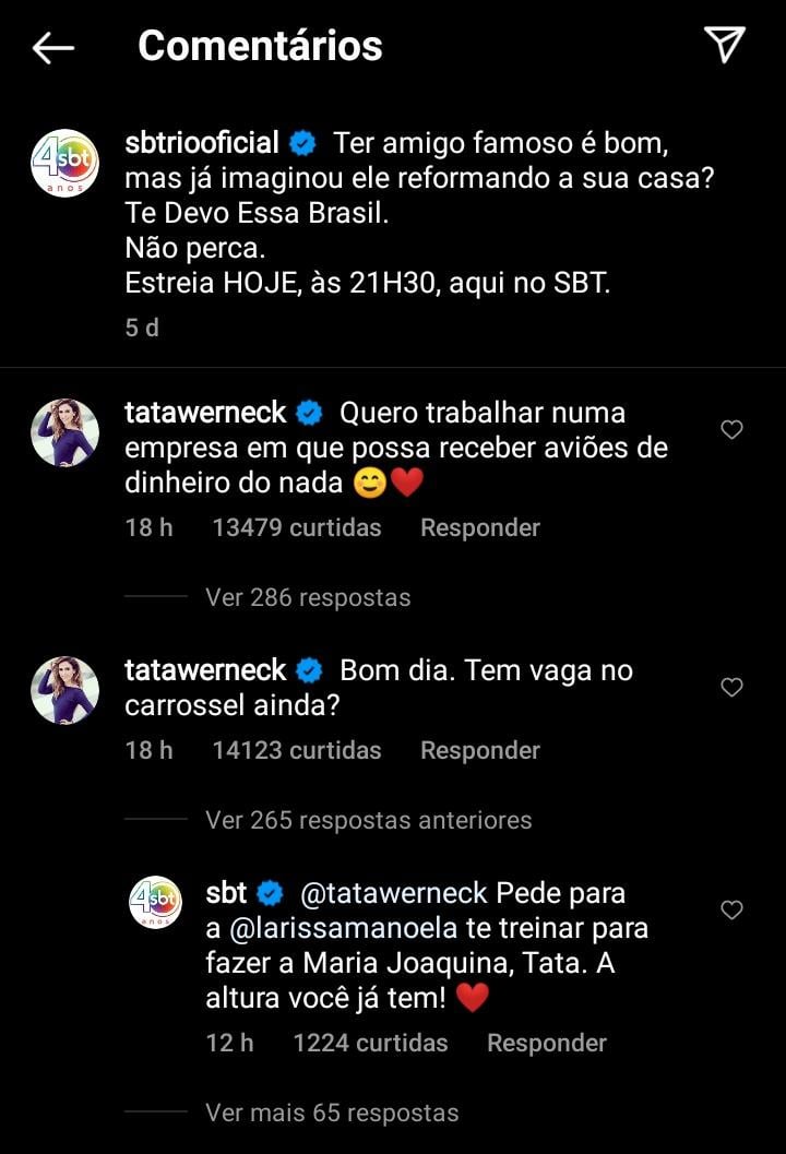 É claro que a gente não ia deixar a humorista sem uma resposta. “Pede para a Larissa Manoela te treinar para fazer a Maria Joaquina, Tatá. A altura você já tem!”, respondeu a página.