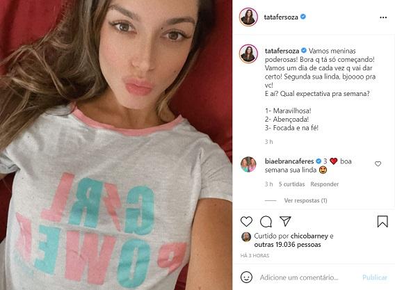 “Vamos meninas poderosas! Bora q tá só começando! Vamos um dia de cada vez q vai dar certo! Segunda sua linda, bjoooo pra vc! E aí? Qual expectativa pra semana?”, questionou ela na legenda.