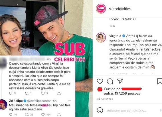 Zé Felipe saiu em defesa da esposa, Virginia Fonseca, nesta quarta-feira (30), após se deparar com um comentário rude à respeito de a influenciadora não amamentar mais a filha, Maria Alice, que completou um mês no último dia 29.
