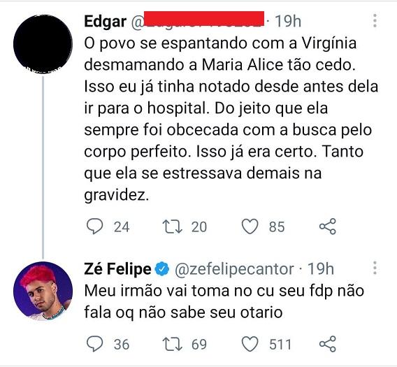 Zé Felipe xinga seguidor após crítica sobre Virginia não amamentar a filha