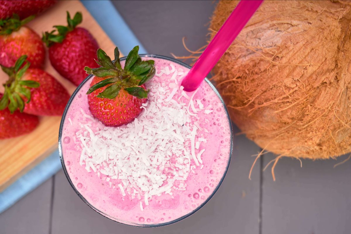 Modo de preparo: Prepare uma gelatina conforme instruções da embalagem. Bata no liquidificador a gelatina, o leite de coco, o mel, a água e os morangos. Coloque em taças e leve para gelar. Quando começar a ficar um creme firme, finalizar com o coco ralado por cima de cada taça e volte para a gelar por mais 2 horas antes de servir.
