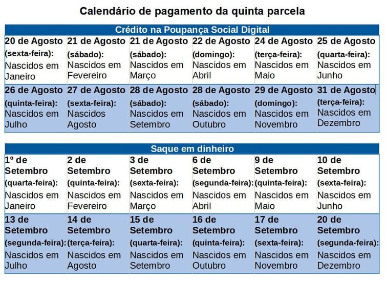 O pagamento da quinta parcela aos inscritos no Bolsa Família começou no último dia 18 e segue até o dia 31. O auxílio emergencial somente será depositado quando o valor for superior ao benefício do programa social.