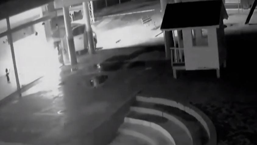 O carro que aparece nas imagens bate contra a pilastra de concreto e, em seguida, os dois ocupantes saem do veículo.