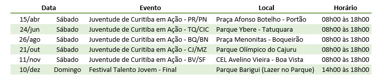 Neste ano, o festival foi ampliado e contará com cinco etapas regionais a serem realizadas nos eventos Juventude de Curitiba em Ação. Confira o cronograma: