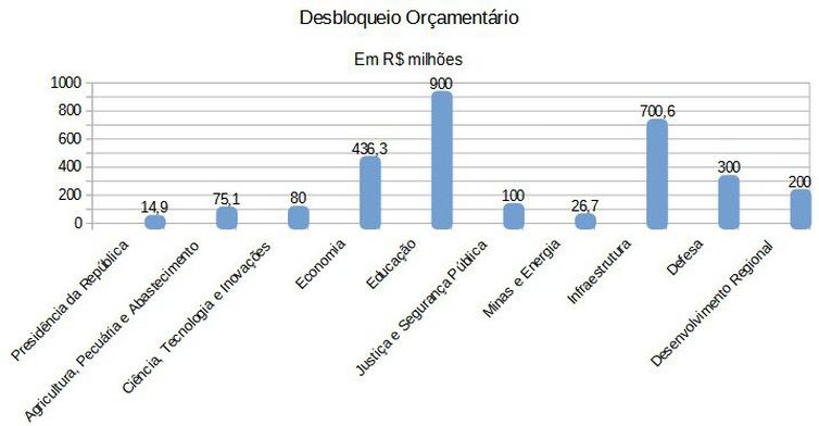 O ministério que teve o maior desbloqueio foi o da Educação, que teve bloqueio inicial total de R$ 2,7 bilhões. Hoje, foram liberados R$ 900 milhões. Ainda há 1,5 bilhão de bloqueio remanescentes.