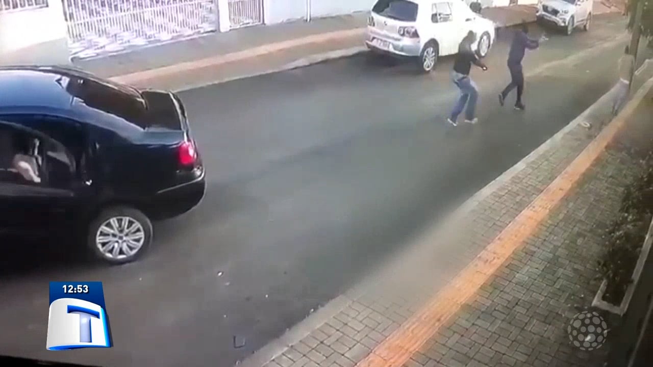 Nesse momento, o passageiro atrás do motorista está com o vidro aberto, e assim que o carro para ao lado de Jhonatan, ele dispara várias vezes contra o rapaz que corre e é perseguido por outros dois ocupantes do carro.