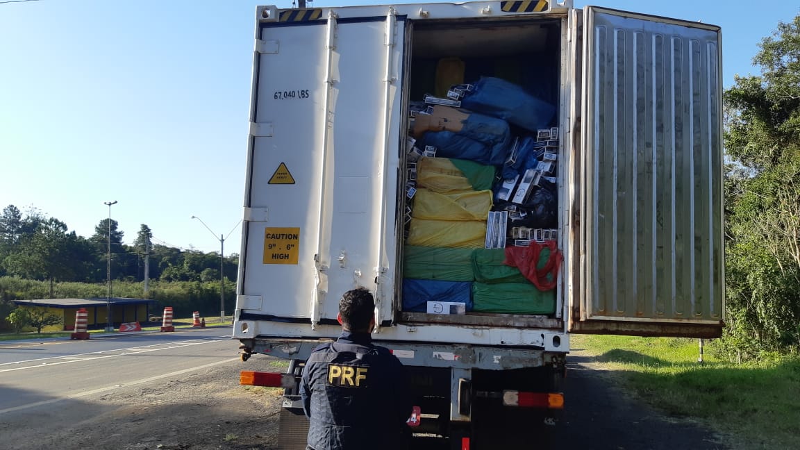A Polícia Rodoviária Federal (PRF) apreendeu, no início da tarde desta sexta (21), cerca de 600 mil maços de cigarros contrabandeados do Paraguai estocados em um caminhão container adulterado, na cidade de Tibagi.
