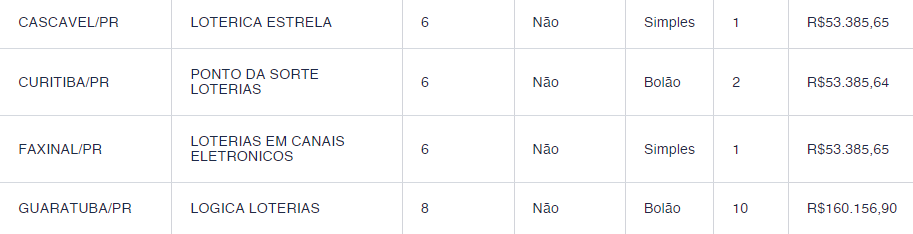 No Paraná, os sortudos de Cascavel e Faxinal fizeram apostas simples e vão receber R$ 53.385,65. Além disso, um bolão de duas cotas de Curitiba vai levar R$ 53.385,64 e um bolão de 10 cotas de Guaratuba vai receber R$ 160.156,90.