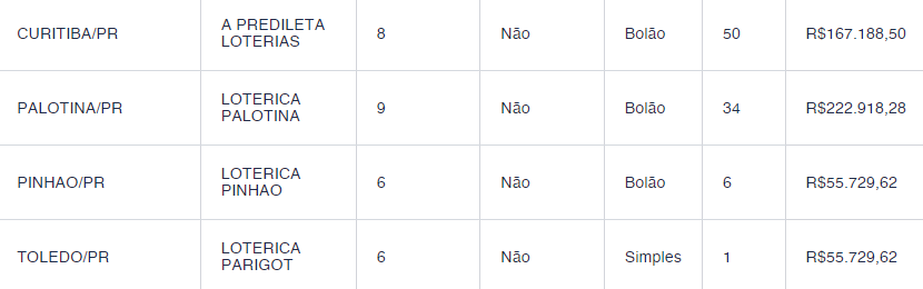 No Paraná, os sortudos são de Curitiba, Palotina, Pinhão e Toledo. Em Curitiba, um bolão de 50 cotas acertou a quina e vai levar R$ 167.188,50. Outro bolão, agora de Palotina, com 34 cotas vai receber R$ 222.918,25.