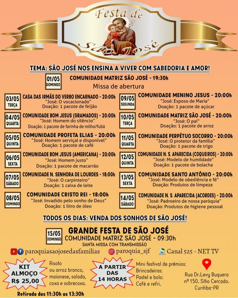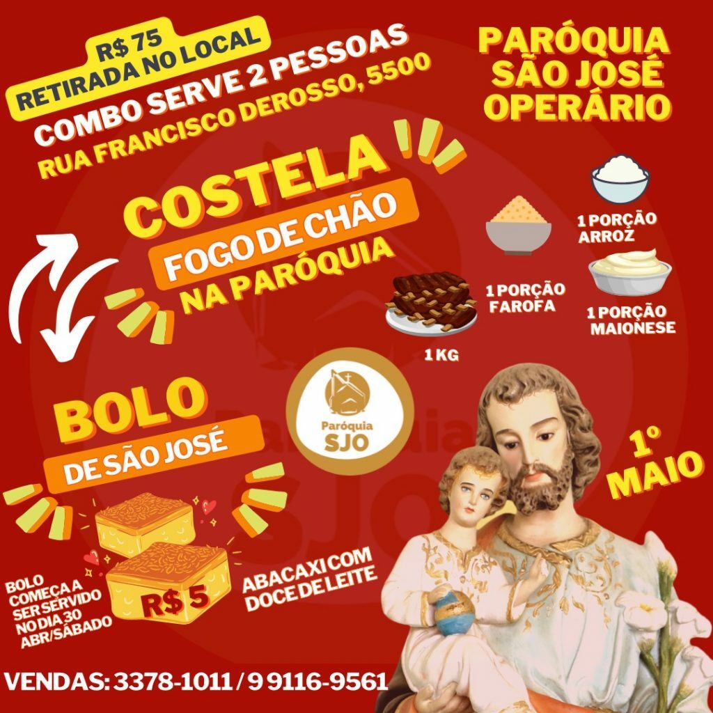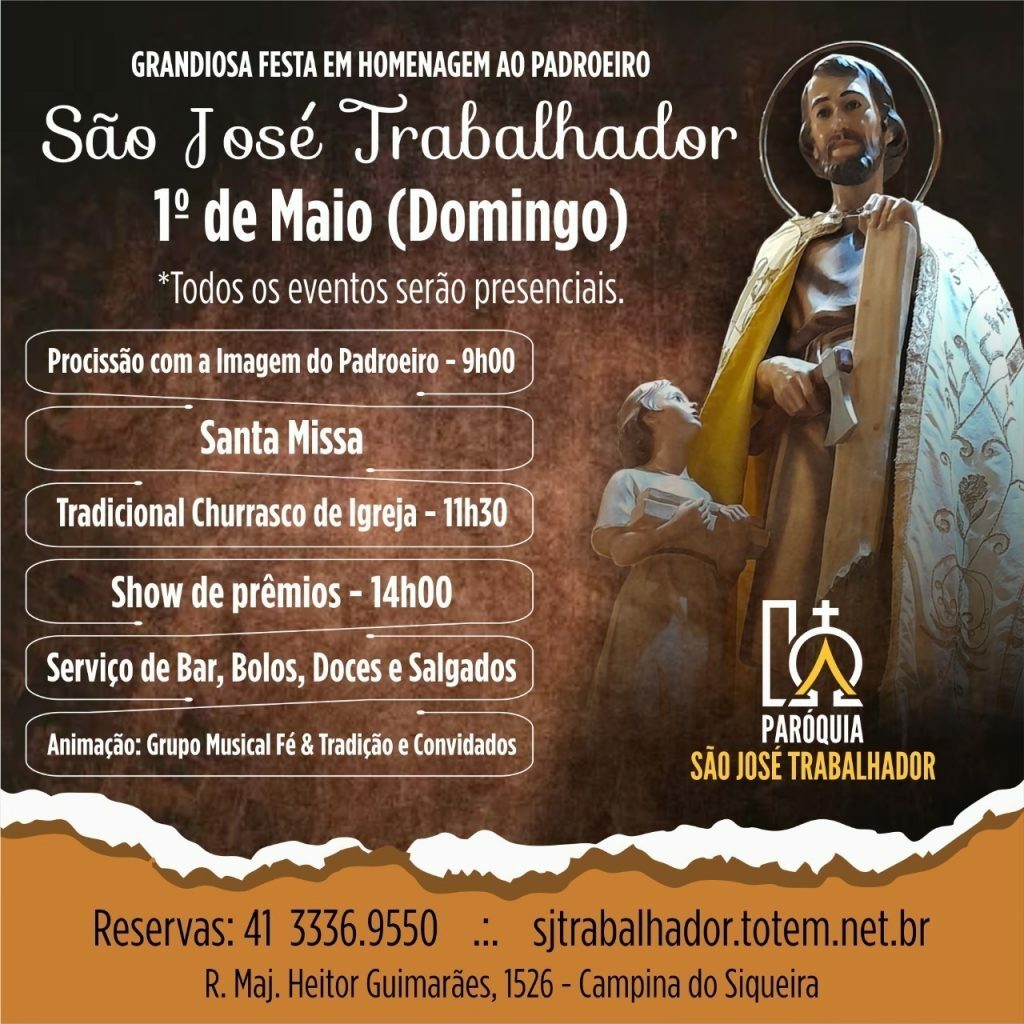 No Alto Boqueirão, os paroquianos da São José Operário estão animados com a comemoração do padroeiro. Haverá missa solene, bolo de São José – que terá cerca de 13 metros de comprimento – e a venda do combo com costela fogo de chão.