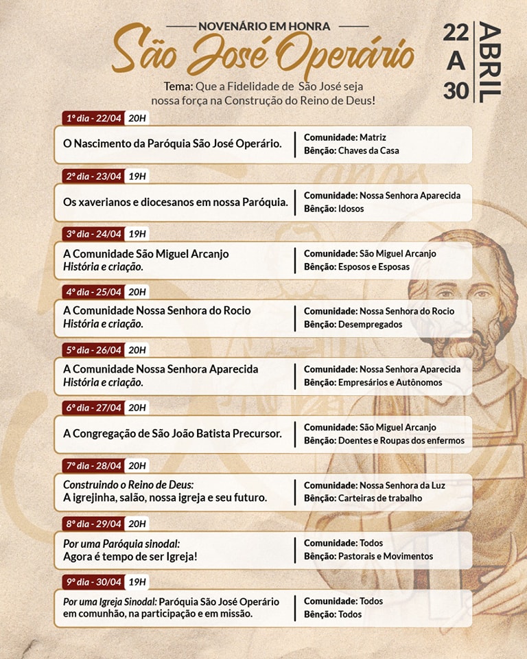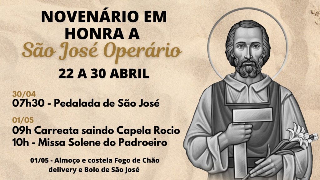 Desde o dia 22 de abril, a paróquia reza o novenário em honra a São José Operário. As novenas estão sendo preparadas pelas comunidades locais pertencentes à paróquia e no final de todas as celebrações há quermesse com pratos deliciosos.