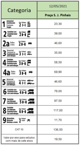 - Veículos comerciais = R$ 19,50 (por eixo);
