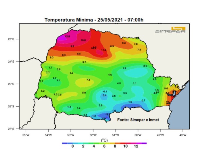 O mapa mostra as temperaturas mínimas registradas pelas redes de estações meteorológicas do Simepar e Inmet.