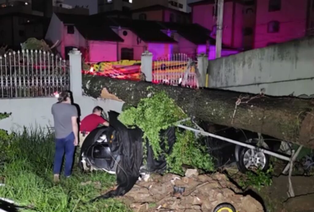 A forte chuva acompanhada de rajadas de vento que atingiu Curitiba na noite deste domingo (1) provocou estragos severos e momentos de tensão para moradores da zona sul, o vento derrubou uma árvore sobre carros.
