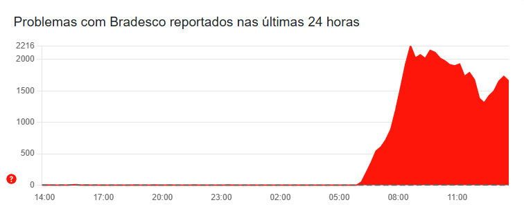 Segundo dados do site Downdetector, os registros de falhas nos serviços do aplicativo Bradesco começaram a aumentar por volta das 8h30 (horário de Brasília).