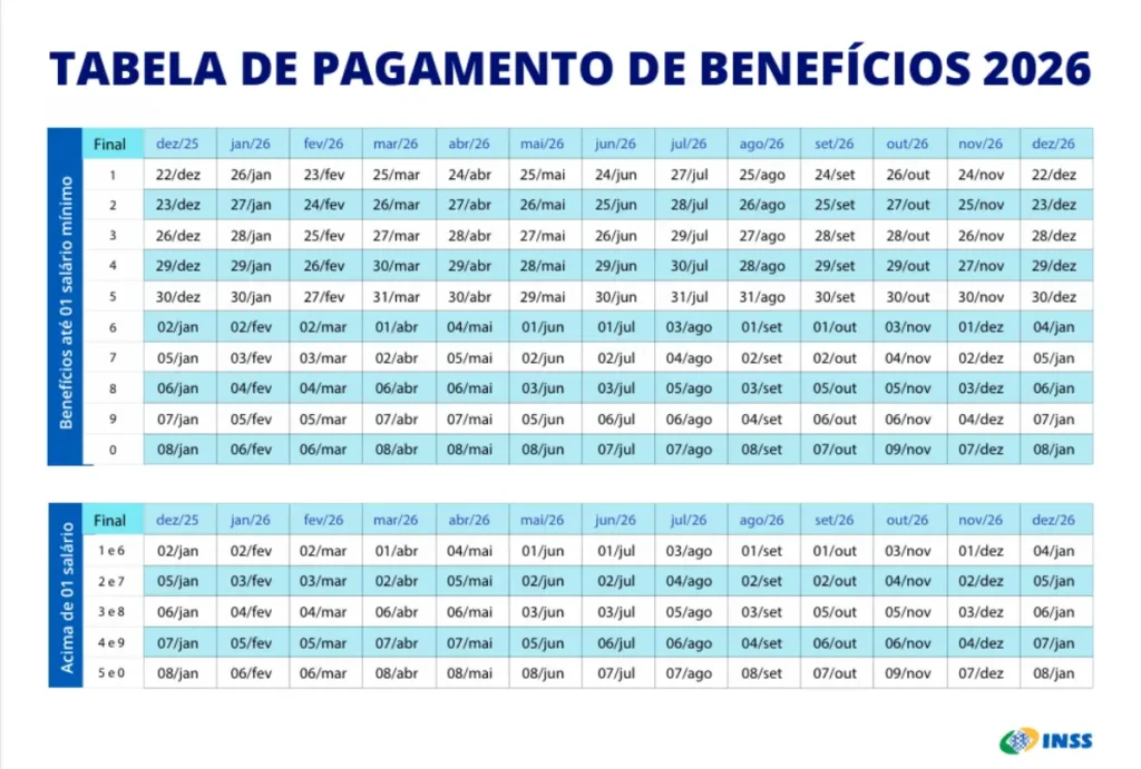 Para quem recebe até o salário mínimo, o calendário de janeiro começa com os benefícios de final 1, no dia 26 de janeiro. Para quem recebe acima desse valor, o cronograma inicia com os benefícios de finais 1 e 6, com pagamento em 2 de fevereiro.