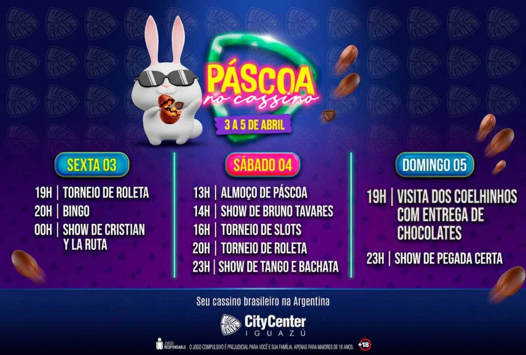 Para o feriado de Páscoa, o Cassino City Center Iguazú preparou uma programação especial que acontece de sexta-feira (03) a domingo (05), reunindo torneios, shows ao vivo, atrações temáticas e experiências gastronômicas.