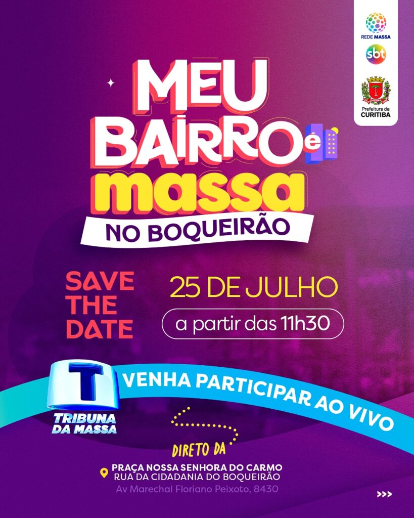 Depois do sucesso da estreia, o Meu Bairro é Massa desembarca no bairro Boqueirão, em Curitiba, nesta sexta-feira (25). A edição será transmitida ao vivo pelo Tribuna da Massa, com apresentação de Lucas Rocha, direto da Rua da Cidadania da Regional Boqueirão.