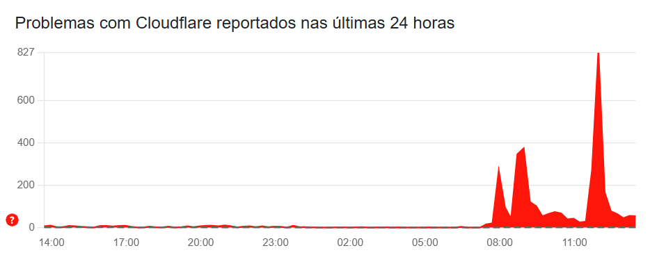 Dados do Downdetector apontam um aumento expressivo de reclamações entre 7h53 e 9h23, com pico às 12h01, quando foram registradas 588 notificações de falha relacionadas à queda da Cloudflare.