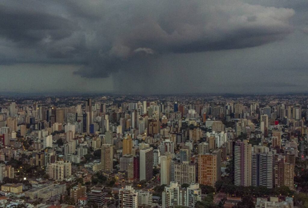 A umidade relativa do ar fica elevada, oscilando entre 58% e 97%, cenário que favorece a formação de nuvens carregadas.