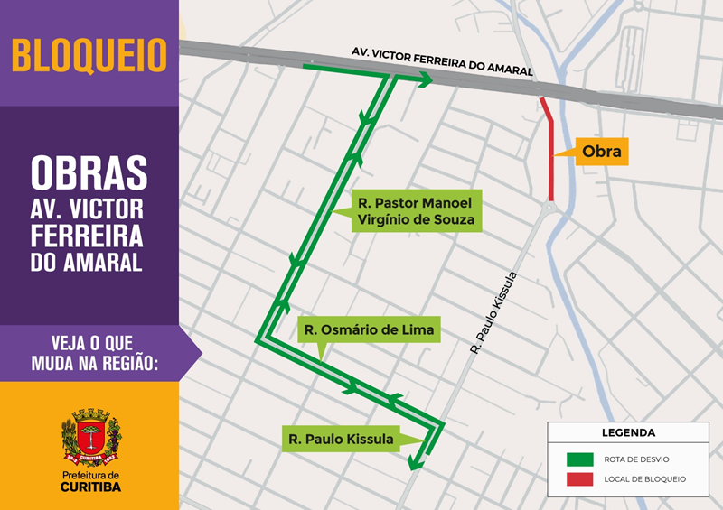 Já os motoristas que desejam acessar a Avenida Victor Ferreira do Amaral sentido Curitiba-Pinhais podem trafegar pela Paulo Kissula até a altura do cruzamento com a Rua Osmário de Lima, quando deverão dobrar à esquerda e depois à direita na Rua Pastor Manoel Virgínio de Souza para entrar na Avenida Victor Ferreira do Amaral.